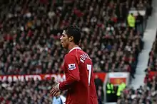 Ronaldo scored his first hat-trick for United in a 6–0 win against Newcastle United on 12 January 2008, which put United top of the league table.[82] On 19 March, he captained United for the first time in a home win over Bolton and scored both goals in a 2–0 win.[83] His second goal was his 33rd of the campaign, surpassing George Best's total of 32 goals in the 1967–68 season, setting the club's new single-season record by a midfielder.[84] His 31 league goals earned him the Premier League Golden Boot,[85] as well as the European Golden Shoe, which made him the first winger to win the latter award.[86] He additionally received the PFA Players' Player of the Year and FWA Footballer of the Year awards for the second consecutive season.[87][88] In the knockout stage of the Champions League, Ronaldo scored the decisive goal against Lyon to help United advance to the quarter-finals 2–1 on aggregate;[89] while playing as a striker, he scored with a header in the 3–0 aggregate win over Roma.[90] United reached the final against Chelsea in Moscow on 21 May, where, despite his opening goal being negated by an equaliser and his penalty kick being saved in the shoot-out,[91] United emerged victorious 1–1, winning the penalties 6–5.[92][93] As the Champions League top scorer, Ronaldo was named the UEFA Club Footballer of the Year.[94]