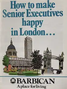 The estate was built between 1965 and 1976, on a 35-acre (14 ha) site that had been bombed in World War II. The complex was designed by architects Chamberlin, Powell and Bon, whose first work was the ground-breaking Golden Lane Estate immediately north of the Barbican. Unlike its northern neighbour, however, the Barbican Estate was not social housing. Rather, it was designed and built for affluent City professionals and their families, with all flats let out at commercial rents by the Corporation of London.[16] To help let out the flats, brochures were produced, advertising the Barbican Estate as containing the perfect residences for well-heeled professionals and international businesspeople.[17]
