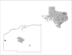 According to the United States Census Bureau, the city has a total area of 1.0 square mile (2.6 km2), of which 0.004 square miles (0.01 km2), or 0.50%, are water.[5] The city sits on a watershed divide, with the north side draining towards the South Sulphur River, part of the Red River watershed, and the south side of the city draining towards Lake Fork Creek, part of the Sabine River watershed.