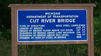 The bridge was built in 1947 and is one of only two cantilevered deck truss bridges in Michigan, it is 641 feet (195 m) long and contains 888 short tons (793 long tons; 806 t) of structural steel. The bridge carries traffic on US 2 above and spans the Cut River Valley, 147 feet (45 m) below.