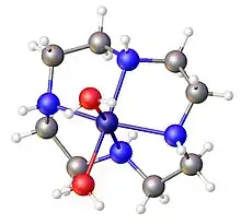 Coordination complexes of cyclen have been studied extensively.[5][6] With a 12-membered ring, it tends to bind to four contiguous sites on octaheral metal centers. In contrast the larger cyclam ligand tens to form attach to four coplanar sites. It also forms complexes of the type [Ln(cyclen)2]3+ where Ln = lanthanide.[7]