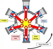The Cyclone Waste Heat Engine (WHE) is a single-acting, Uniflow steam engine. The two main variations are the WHE-25, a six-cylinder radial engine that was under development until November 2013, and the 3-cylinder WHE-DR that has been under development since.[2] A display model of a 12-cylinder radial engine was built,[3] but it is not known if any working engines were built in this configuration.