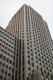 The massing was influenced by the requirements of the 1916 Zoning Resolution.[13][15] The 36-story tower, built between 1928 and 1930, is on the northern portion of the site, facing 42nd Street.[16][17] It is "L"-shaped, with a frontage of 91 feet (28 m) along the middle of the block on 42nd Street, and a frontage of 300 feet (91 m) on 41st Street extending eastward to Second Avenue.[18] The original tower contains several setbacks on all four sides. The northern elevation along 42nd Street contains one large setback at the 9th floor.[16][17][lower-alpha 1] The western elevation has multiple smaller setbacks. The southernmost ten bays of the western elevation are set back at the 9th floor, while the following two bays to the north are set back the same distance above the 15th floor, creating a zigzag effect. The southern elevation contains small setbacks at the 7th and 13th floors, as well as larger setbacks at the 27th floor and above the 36th floor. The eastern elevation does not contain any setbacks, except for the northernmost seven bays, which protrude slightly below the 33rd floor.[16][17]