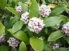 Daphne odora, winter daphne, is a species of flowering plant in the family Thymelaeaceae, native to China, later spread to Japan and Korea. It is an evergreen shrub, grown for its very fragrant, fleshy, pale-pink, tubular flowers, each with four spreading lobes, and for its glossy foliage. It rarely fruits, producing red berries after flowering.