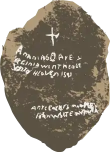 The Dare Stones are a series of stones inscribed with messages supposedly written by members of the lost Roanoke Colony, allegedly discovered in various places across the Southeastern United States in the late 1930s.[1][2]: back cover The colonists were last seen on Roanoke Island, off the coast of what is now North Carolina, in August 1587, and the mystery of their disappearance has since become a part of American folklore.[3]: 6–7 The stones created a media circus in the United States, as the public became fascinated with the possible resolution of the Lost Colony's fate.[2]: 7, 161 [3]: 244
