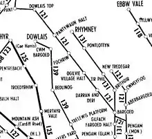 Darran and Deri railway station was situated on the Brecon and Merthyr Junction Railway, serving the adjoining village of Deri and the nearby Darran Colliery. It was located at 20 miles 08 chains from Newport. The line was built and owned partly by the Rhymney Railway and partly by the Brecon and Merthyr Railway, the boundary between the two companies lying a short distance north of Darran and Deri. The line passed to the Great Western Railway in 1923 and to British Railways (Western Region) in 1948.[1]