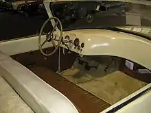 The Davis Divan measured 183.5 inches (466 cm) in length with a wheelbase of 109.5 inches (278 cm), which was remarkably long for a three-wheeled vehicle; it had a height of 60.0 inches (152 cm) and weighed 2,450 pounds (1,110 kg).[9][12] With a width of 72.0 inches (183 cm), it was wide enough to seat four passengers abreast on its single bench seat;[5][8][9] in fact, this feature had inspired the name of the car, which was the Arabic term for a couch or day bed.[9][14] The car also featured a removable fiberglass top along with a steel chassis and chrome-trimmed aluminum body,[3][6][10] which sported aircraft-inspired styling details, 15-inch (38 cm) wheels, disc brakes, and hidden headlights.[4][5][13][14] The Divan was built with a channel steel frame and 11 body panels made of aluminum and zinc, while the "Baby" prototype had instead been constructed with a tube steel space frame.[8][9] The finished car boasted jacks built into each of its corners, which allowed for easier tire changing.[4][8][9][15]