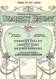 Dearest Enemy is a musical with a book by Herbert Fields, lyrics by Lorenz Hart, and music by Richard Rodgers. This was the first of eight book musicals written by the songwriting team of Rodgers and Hart and writer Herbert Fields, and the first of more than two dozen Rodgers and Hart Broadway musicals.[1] The musical takes place in 1776, during the American Revolutionary War, when Mary Lindley Murray detained British troops long enough in Manhattan to give George Washington time to move his vulnerable troops.