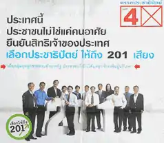 The Democrat Party (Thai: พรรคประชาธิปัตย์; RTGS: Phak Prachathipat) is a Thai political party.[13] The oldest party in Thailand, it was founded as a royalist party; it now upholds a conservative[12][14] and pro-market position.[9][28]