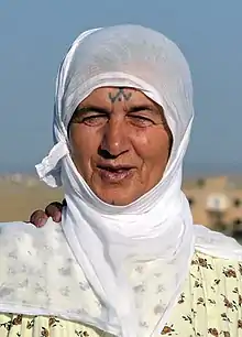 Deq (Kurdish: deq, دەق) or xal (Kurdish: xał, خاڵ) are the traditional and unique tattoos pertaining to Kurds. Deq is more commonly found among Kurdish women, but is also observed among men. However, the practice of deq has become less common due to the influence of Islam and has been substituted with henna. Unlike the henna, deq is not temporary. Efforts have been made to revitalize the usage of deq as a way of reasserting one's Kurdish identity.[1] Deq is also practiced by Yazidis and to a higher degree.[1]