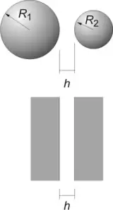 where W(h) is the interaction energy per unit area between the two planar walls and Reff the effective radius. When the two bodies are two spheres of radii R1 and R2, respectively, the effective radius is given by