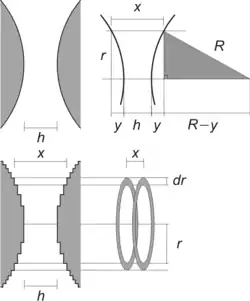 where x is the distance between the disks and dA the area of one of these disks. This distance can be expressed as x=h+2y. By considering the Pythagorean theorem on the grey triangle shown in the figure one has