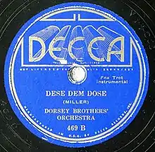 Dese Dem Dose[1] was recorded in New York on February 6, 1935, and was released as a 78 by The Dorsey Brothers on Decca paired with "Weary Blues" as Decca 469B.[2][3] Ray McKinley, the drummer in the Dorsey Brothers band, recalled: "Glenn did write a few things for us. I remember one thing called 'Dese, Dem and Dose' that he wrote and we recorded. He used to carry a little organ around with him to work on."[4] The recording was released on the 1950 Decca LP Dixieland Jazz, 1934-1935, Volume 1 by the Dorsey Brothers' Orchestra, DL 6016, as an album of 78s as A-689, and as an album of 45s as 9-255, the 1999 Avid compilation The Dorsey Brothers, the 2010 Hallmark album Bring Back The Good Times, the 2006 album Essential Collection on West End Records, the Circle collection The Dorsey Brothers Orchestra, 1935, and the 2010 Hallmark collection The Fabulous Dorseys Play Dixieland Jazz.
