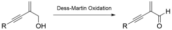 One example of the Dess–Martin oxidation involves transforming a sensitive α-β-unsaturated alcohol to its corresponding aldehyde. This moiety has been found in several natural products and due to its high functionality, it could be a valuable synthetic building block in organic synthesis. Thongsornkleeb and Danheiser oxidized this sensitive alcohol by employing the Dess Martin Oxidation and altering the work up procedure (diluting with pentanes, washing with poly(4-vinylpyridine) to remove the acetic acid generated during the reaction, filtering and concentrating via distillation.[12]