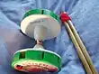 Monobolo is a variation of the diabolo where instead of having two diabolo cups, there is only one and a weight on the other side. The monobolo can be used in the same fashion as normal diabolos. However, if a monobolo is put into excalibur, or horizontally, monobolos can be manipulated to be like a spinning top. To start a monobolo, twist the string around the axle and then let it gain some speed.