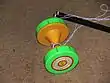 The size and weight of diabolos varies. Diabolos with more weight tend to retain their momentum for longer, whereas small, light diabolos can be thrown higher and are easier to accelerate to high speeds.[23] Rubber diabolos are less prone to breakage but are more prone to deformations. More commonly used are plastic-rubber hybrids that allow flex but hold their shape. The size of the disc or cone varies, as do the presence and size of holes in the discs or cones which may alter the sound produced. In yo-yos a cone is known as the butterfly shape. Regardless of the presence, size, and shape, "once a diabolo is spinning, the friction of the spinning diabolo against the string creates a whining sound; this is called 'making the diabolo sing.'"[20] "When played hard, the [Chinese] yoyo will give out a sharp shrill sound...The shrill sound would add an exciting atmosphere to the [Shanghai winter] festivals...A skillful player can use a pot cover [with a round handle] as a yoyo [without sound]."[21] A fast whirling kouen-gen produces "a shrill whistling sound...not unlike the note of the steam siren".[15] Diabolos with only one cup ("monobolos") are also used.