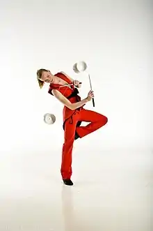 The diabolo (/diːˈæbəloʊ/ dee-AB-ə-loh;[1] commonly misspelled diablo) is a juggling or circus prop consisting of an axle (British English: bobbin) and two cups (hourglass/egg timer shaped) or discs derived from the Chinese yo-yo. This object is spun using a string attached to two hand sticks ("batons" or "wands"). A large variety of tricks are possible with the diabolo, including tosses, and various types of interaction with the sticks, string, and various parts of the user's body. Multiple diabolos can be spun on a single string.[2]