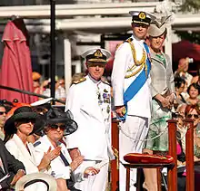 The Queen's husband, Prince Philip, Duke of Edinburgh, was hospitalised with a bladder infection on 4 June and thus was not able to attend any of the official events. In his speech given at the conclusion of the Diamond Jubilee Concert, the Prince of Wales commented on the sadness of his father's absence and urged the crowd to cheer loud enough for the Duke to hear in hospital.[23] Prince Edward, Earl of Wessex, stated after visiting his father that the latter was watching the celebrations on television.[24] The Queen visited the Duke the following day.[25]