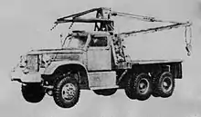 The wrecker had a Holmes twin-boom design with a swinging boom and powered hoist cable on each side. When towing the booms were rotated to the rear, connected at the ends, and worked as one A-frame. When lifting the booms could be separated and rotated 90% forward to the side, an outrigger could be lowered to increase lifting capacity. A power take-off on the transfer case drove a transmission with two winches in the wrecker frame. Controls on both sides of the body allowed each winch to raise or lower independently of the other. The body had low sides on the rear half which tapered to the floor in the front, making clearance for the boom to swing. A brace for the wrecker frame held a spare tire. Welding tanks, an air compressor, cables, block and tackle, chains, tow-bars, and other equipment were carried.[22][23]
