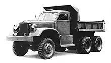 The dump had a 12 feet (3.7 m) long 4 cubic yards (3 m3) steel body that was raised and lowered by a hydraulic cylinder and lever arrangement under the body. A power take-off on the transfer case, used with the transmission in gear, drove the hydraulic pump, the controls were inside the cab. The body had a tailgate that hinged from either the top or bottom. When the tailgate was hinged at the top the bottom could be opened while dumping with a lever on the left front corner of the body, just behind the driver's window. The front of the body had a stone-shield that covered the cab and the spare tire mounted between the cab and body.[26][27]