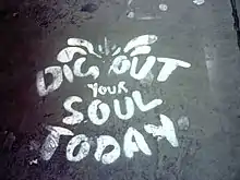 British creative agency Intro was responsible for the Dig Out Your Soul promotion. Initially they were approached only for the album cover, for which the band chose Intro's creative partner Julian House, who became the campaign's art director.[13] Promotion in the United Kingdom included television advertising and the use of billboards throughout major cities in the UK. Advertising was also taken in national newspapers around the time of the album's release. The album was also advertised for free on social networking website, Myspace.[14] The comedian Russell Brand, a friend of Noel Gallagher, lent his voice to the album's TV campaign.