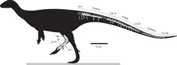 The holotype individual, thought to be an older juvenile, was estimated to be 1.2 metres (3.9 ft) in length, using the proportions of Hypsilophodon to fill in unknown areas; it has been compared to the size of a modern wild turkey. It was noted, however, that the tail being preserved in a curled fashion made exact tail length uncertain, owing to difficulty in measuring intervertebral space; the size estimate is therefore uncertain. Based on an isolated caudal vertebra, NMV P229456, twice the length of vertebrae from the holotype, adults are estimated to have measured at least 2.3 metres (7.5 ft) long, closer to the size of a rhea, and still small for an ornithopod.[1] The taxon was noted in Herne's PhD thesis as being distinctly more robust than other assumed relatives from the area.[3] Ten autapomorphies, unique traits, were identified in the holotype.[1]