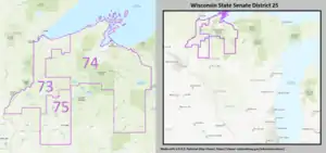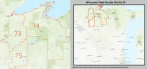 The 25th Senate District of Wisconsin is one of 33 districts in the Wisconsin State Senate.[2] Located in northwest Wisconsin, the district comprises all of Ashland, Barron, Bayfield, Burnett, Douglas, Iron, Price, and Washburn counties, and part of northern Sawyer County. The 25th Senate district is the largest Wisconsin Senate district by area; mostly rural, the largest population center is the city of Superior. The district also includes the Bad River and Lac du Flambeau Indian reservations, and most of the Chequamegon–Nicolet National Forest.[3]