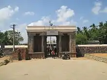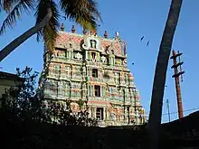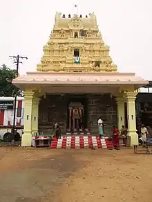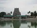 The Pundarikakshan Perumal temple is believed to have been built by the Pallava king Dantivarman (796–847 CE).[17][18] A swastika-shaped temple tank built during 800 CE is present in the south-western corner of the street around the temple. It has four stepped gateways, each having 51 steps. The tank is believed to have been built by Kamban Araiyan during the reign of Dantivarman. In modern times, it is maintained by the Department of Archaeology of the Government of Tamil Nadu. The temple complex covers an area of 2.62 ha (6.5 acres), while the tank covers an area of 0.1256 ha (0.310 acres).[19][20] The chariot festival is unique in the state as a community feast is offered by several individuals and committees, a custom many centuries old.[21][22] |