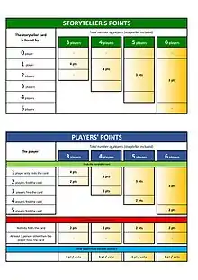 | 0 | (no players voted for the storyteller's card) | 1 (for each vote received)[lower-alpha 1][lower-alpha 2] 1 (for single vote)[lower-alpha 3] | ||