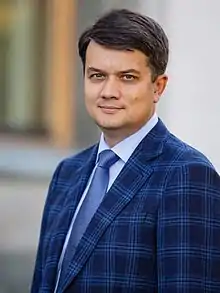 Dmytro Oleksandrovych Razumkov (Ukrainian: Дмитро Олександрович Разумков; born 8 October 1983[1][2]) is a Ukrainian politician and former Chairman of the Verkhovna Rada (from August 2019 to 7 October 2021).[1][3] Previously he was leader of the Servant of the People party.[4][5] In the 2019 Ukrainian parliamentary election he led the party to a win of 124 seats on the nationwide party list and 130 constituency seats.[6][4]