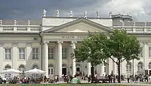 There are also a number of works that are usually presented outside, most notably in Friedrichsplatz, in front of the Fridericianum and the Karlsaue park. To handle the number of artworks at documenta IX, five connected temporary "trailers" in glass and corrugated metal were built in the Karlsaue.[29] For documenta (13), French architects Anne Lacaton and Jean-Philippe Vassal constructed the temporary "Aue-Pavillon" in the park.
