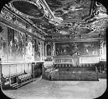 • The Council Chamber: the Full College was mainly responsible for organizing and coordinating the work of the Venetian Senate, reading dispatches from ambassadors and city governors, receiving foreign delegations and promoting other political and legislative activity. Alongside these shared functions, each body had its own particular mandates, which made this body a sort of "guiding intelligence" behind the work of the Senate, especially in foreign affairs. The decorations were designed by Andrea Palladio to replace those destroyed in the 1574 fire; the wood panelling of the walls and end tribune and the carved ceiling are the work of Francesco Bello and Andrea da Faenza. The paintings in the ceiling were commissioned from Veronese, who completed them between 1575 and 1578. This ceiling is one of the artist's masterpieces and celebrates the Good Government of the Republic, together with the Faith on which it rests and the Virtues that guide and strengthen it. Other paintings are by Tintoretto and show various Doges with Christ, the Virgin and saints.