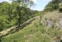 The fort covers an area of 9.1 hectares (22 acres) and commands views over the surrounding countryside.[7] The hill fort is bivallate on three sides and a single rampart on the southern side which is protected by a steep slope.[8] It is almost rectangular with the longest axis from east to west being 487 metres (1,598 ft) long and 200 metres (660 ft) from north to south, surrounded by a rampart which is around 4 metres (13 ft) high and 12 metres (39 ft) wide.[9] It was protected by a limestone rampart with a ditch and counterscarp on all sides but the south. There is an inturned entrance on the west and an annexe of 0.4 hectares (0.99 acres) protecting the easier eastern approach.[10]
