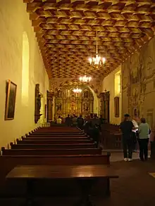 The original mission was a small structure dedicated on October 9, 1776, after the required church documents arrived. It was located near what is today the intersection of Camp and Albion Streets (according to some sources),[13] about a block-and-a-half east of the surviving adobe Mission building, and on the shores of the now filled Laguna de Los Dolores.[4] A historical marker at that location depicts this lake, but whether it ever actually existed is a matter of some dispute. (Creek geologists Janet Sowers and Christopher Richard propose that the legendary lake is the result of misunderstandings of Juan Bautista de Anza's 1776 writings. According to their 2011 hydrological map, there were no lakes in the area, only creeks.)[14]