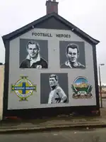 Windsor Park, the home of both Linfield F.C. and the Northern Ireland national football team is accessible from Donegall Avenue, a street that leads off the Donegall Road. As a consequence, both the club and national team are well supported within the road's community and are celebrated by murals in the Village area. The Donegall Road also features in a popular chant that Linfield supporters often sing.[27] A supporters club for Scottish Premier League club Rangers F.C. is located at Barrington Street, adjacent to the Donegall Road.[28] As stated, Belfast Celtic previously made their home on the Donegall Road. However the club left the Irish Football League in 1949, after a series of sectarian incidents at matches, notably at Windsor Park. Their stadium remained as a venue for greyhound racing until it was demolished in the 1980s.[29]