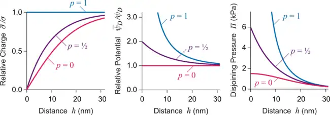 Repulsion is strongest for the CC conditions (p = 1) while it is weaker for the CP conditions (p = 0). The result of the superposition approximation is always recovered at larger distances but also for p = 1/2 at all distances. The latter fact explains why the superposition approximation can be very accurate even at small separations. Surfaces regulate their charge and not infrequently the actual regulation parameter is not far away from 1/2. The situation is exemplified in the figure below. From stability considerations one can show that p < 1 and that this parameter may also becomes negative. These results can be extended to asymmetric case in a straightforward way.[5]