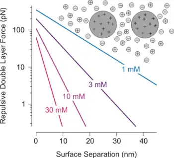 Double layer forces occur between charged objects across liquids, typically water. This force acts over distances that are comparable to the Debye length, which is on the order of one to a few tenths of nanometers. The strength of these forces increases with the magnitude of the surface charge density (or the electrical surface potential). For two similarly charged objects, this force is repulsive and decays exponentially at larger distances, see figure. For unequally charged objects and eventually at shorted distances, these forces may also be attractive. The theory due to Derjaguin, Landau, Verwey, and Overbeek (DLVO) combines such double layer forces together with Van der Waals forces in order to estimate the actual interaction potential between colloidal particles.[1]