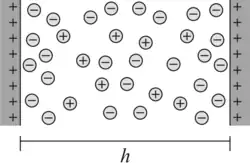 The concentration difference can be eliminated with the Poisson equation and the resulting equation can be integrated from infinite separation of the plates to the actual separation h by realizing that