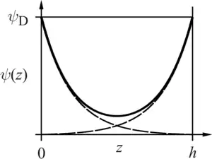 where z is the distance from the surface and ψD the surface potential. The potential at the midplane is thus given by twice the value of this potential at a distance z = h/2. The disjoining pressure becomes[1][4]