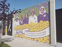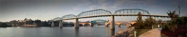 Downtown Chattanooga has four main bridges over the Tennessee River: the Walnut Street Bridge, the Market Street Bridge, the Olgiati Bridge, and the Veterans Memorial Bridge. These bridges allow pedestrians to connect the Riverfront and Northshore to the Tennessee Riverwalk and Bluff View Art District. Downtown Chattanooga parks include Coolidge Park, Renaissance Park, Miller Park, Miller Plaza and Main Terrain Art Park. The Martin Luther King District runs parallel to the University of Tennessee at Chattanooga's campus and features the largest mural in Chattanooga.[65] The 40,000-square-foot mural was created by Philadelphia-based muralist Meg Saligman and seven other local artists.[66]