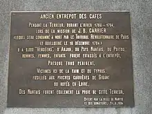 The drownings at Nantes (French: noyades de Nantes) were a series of mass executions by drowning during the Reign of Terror in Nantes, France, that occurred between November 1793 and February 1794. During this period, anyone arrested and jailed for not consistently supporting the Revolution, or suspected of being a royalist sympathizer, especially Catholic priests and nuns, was cast into the river Loire and drowned on the orders of Jean-Baptiste Carrier, the representative-on-mission in Nantes. Before the drownings ceased, as many as four thousand or more people, including innocent families with women and children, died in what Carrier himself called "the national bathtub".[1][2]