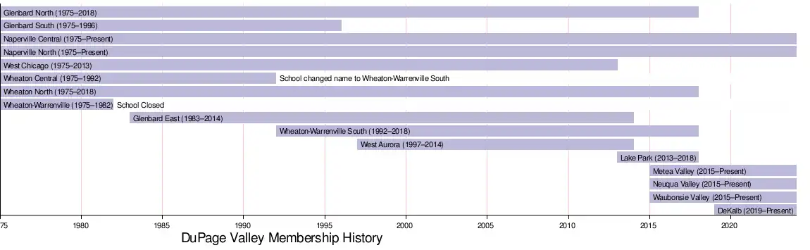 The DuPage Valley Conference was formed prior to the 1975โ76 school year. Its charter members were Glenbard North High School, Glenbard South High School, Naperville Central High School, Naperville North High School, West Chicago Community High School, Wheaton Central High School, Wheaton North High School, and Wheaton Warrenville High School. While the conference has typically kept a constant membership of at least six high schools, the actual membership of the Conference has changed since its founding. The conference experienced the first membership change in 1983, when Glenbard East High School left the Des Plaines Valley League and joined the DVC, replacing Wheaton-Warrenville High School, which was closed due to low attendance. The next change came in 1992, when Wheaton Central High School and Wheaton-Warrenville Middle School changed buildings. The high school (now in the former Wheaton-Warrenville high school building) became known as Wheaton-Warrenville South High School in order to distinguish it from the closed Wheaton-Warrenville; the middle school (in the old Wheaton Central building from 1992-2009) became Hubble Middle School. After the 1996 school year, Glenbard South High School left the DuPage Valley Conference, citing an inability to be competitive with the larger member schools in the league (despite winning a share of the conference title in softball in their final year in the conference). The DuPage Valley Conference operated for one year with only seven schools before admitting former Upstate Eight Conference member West Aurora High School in Aurora, Illinois, the first DVC school outside DuPage County. The move reunited West Aurora with former Upstate Eight charter members Naperville Central, and Wheaton-Warrenville South who were then known as Naperville Community, and Wheaton Community in 1963.