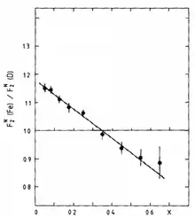 In 1983, the European Muon Collaboration published results from an experiment conducted at CERN in which the DIS reaction was measured for high-energy muon scattering from iron and deuterium targets. It was expected that the cross section for DIS from iron divided by that from deuterium, and scaled by a factor of 28 (the iron-56 nucleus has 28 times more nucleons than deuterium) would be approximately 1. Instead, the data (Fig. 1) showed a decreasing slope in the region of 0.3 < x < 0.7 , reaching a minimum of 0.85 at the largest values of x .