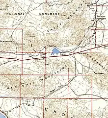 The Victory Hills are a chain of small hills that run east of the Eagle Mountains and provide a minor obstacle to the railroad. The railroad passes through these through a deep cut in the low part between two hills. After crossing Eagle Mountain Road for a second time, the tracks arrive at "Telephone Pass". The railroad today passes between the same two mountains. Telephone Pass is the end of the downhill grade from Summit and for here to the mine is all uphill.