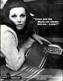 Muntz attempted to establish a modern, trendy image for his players and cartridges. His print advertisements often showed the player installed in an appealing sports car and usually incorporated a young, attractive model with a suggestive tagline. Most of his employees in his California shops were attractive young women dressed in overbright clothing.[35]