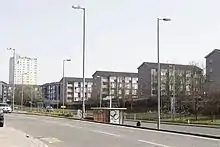 East Kilbride is divided into a number of smaller neighbourhoods bordered by main through-roads. Part of the new town design was that each of these would be a self-contained entity, with a variety of housing types, local shops and primary schools, and accessed safely for pedestrians via paths and underpasses separate from main roads.[20] This is true for the original areas of the new town (principally Calderwood, Greenhills, The Murray, St Leonards and Westwood) while newer developments, such as Stewartfield, Lindsayfield and Mossneuk do not adhere as closely to this model and have a more generic suburban layout of low-density private housing, arranged mainly in cul-de-sacs fed by distributor roads.[35][36]