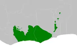 The ecoregion includes the lowland forests extending from the Gulf of Guinea a few hundred kilometres inland, from western Côte d'Ivoire to the western shore of Lake Volta in Ghana. A few enclaves lie further east and inland in the Togo Mountains of Togo, eastern Ghana, and Benin. The Sassandra River of Cote d'Ivoire separates the Eastern Guinean forests from the Western Guinean forests which lie to the west. Inland and to the east, the Eastern Guinean forests transition to the Guinean forest-savanna mosaic.[4]