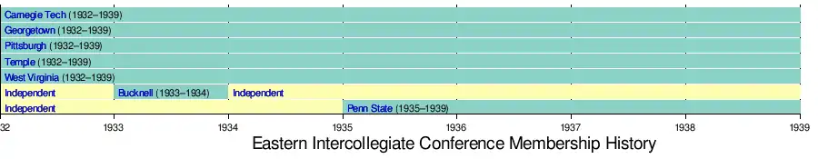 The Eastern Intercollegiate Conference (EIC) was an athletic conference in the National Collegiate Athletic Association in the United States. The conference sponsored men's college basketball and existed from 1932 to 1939, with teams in the District of Columbia, Pennsylvania, and West Virginia.