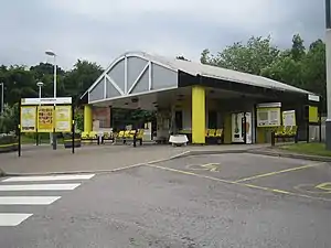 The station is staffed, during all opening hours, and has platform CCTV.[1] There is a payphone, a vending machine and a booking office. There are departure and arrival screens, on the platform, for passenger information. Each of the two platforms has sheltered seating. There is a free car park with 101 spaces, a cycle rack with 6 spaces, and a secure cycle locker with 44 spaces.[2] Access to the station booking office is on the pavement. Access to each of the two platforms is by a stepped ramp. This allows relatively easy access for passengers with wheelchairs or prams.[3]
