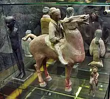 Prior to the Han dynasty, markets close to China's northern border engaged in trade with the nomadic tribes of the eastern Eurasian Steppe.[122] The heqin agreement between the Han and nomadic Xiongnu stipulated the transfer of tributary goods from China. The exact amount of annual tribute sent to the Xiongnu in the 2nd century BC is unknown. In 89 BC, when Hulugu Chanyu (狐鹿姑) (r. 95–85 BC) requested a renewal of the heqin agreement, he demanded an annual tribute of 400,000 litres (11,000 US bu) or 10,000 dan of wine, 100,000 litres (2,800 US bu) or 5,000 hu of grain, and 10,000 bales of silk.[123][124] These amounts of wine, grain, and silk were considered to be a significant increase from earlier amounts of tribute, which must have been much less.[123] Besides these arrangements, the most common commercial exchanges between the Xiongnu and Han merchants consisted of the trading of Xiongnu horses and furs for Han agricultural foodstuffs and luxury items, most notably silk.[122] By means of the black market, the Xiongnu were also able to smuggle Han iron weapons across the border.[122]